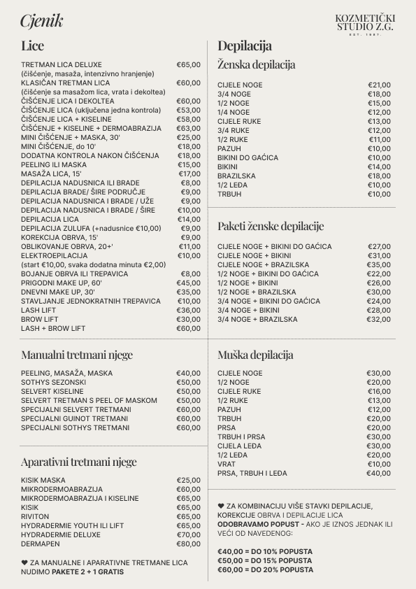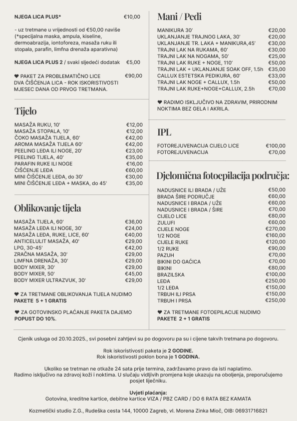 U našem salonu vjerujemo u potpunu transparentnost i želimo da se naši klijenti osjećaju sigurno i informirano pri odabiru svojih kozmetičkih tretmana. Naš detaljni cjenik osmišljen je kako bi vam olakšao istraživanje naše ponude usluga te odabir opcija koje najbolje odgovaraju vašim potrebama i budžetu. Trudimo se ponuditi vam iznimnu kvalitetu po pristupačnim i konkurentnim cijenama – tako da uvijek točno znate što možete očekivati. Pregledajte naše cijene u nastavku i otkrijte savršene tretmane koji će vam pomoći da izgledate i osjećate se najbolje.